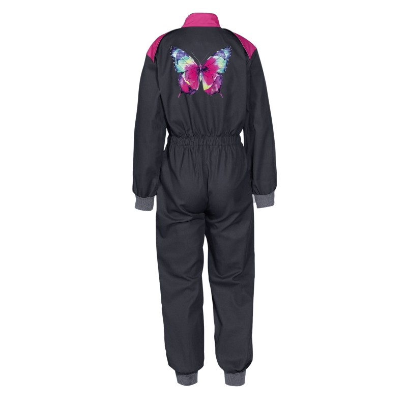 The overall closes with a zipper, has an elastic waistband, a high collar with Velcro fastening, two chest pockets and two lower front pockets. Both chest pockets and the back are printed with playful motifs.